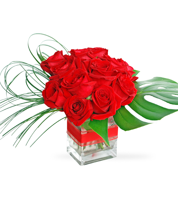 My Love To You is not your typical dozen rose arrangement. This dozen of flame red roses is arranged with style in a clear glass rectangular vase, tied with a ribbon. Pretty Monestera leaf and Bear grass give this arrangement a finishing touch. Fall in love with this arrangement!