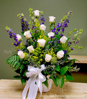 White Rose Arrangement is very simple and elegant floral composition for a funeral. Twelve white long stem roses make up this arrangement along with blue larkspur, yellow solidago, blue limonium, leather and lemon leaves in a white container