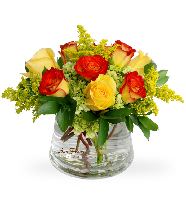 Celebrate Life is a beautiful floral arrangement consisting of yellow and orange bi-color roses, lime green hydrangea, yellow solidago and greenery.
