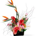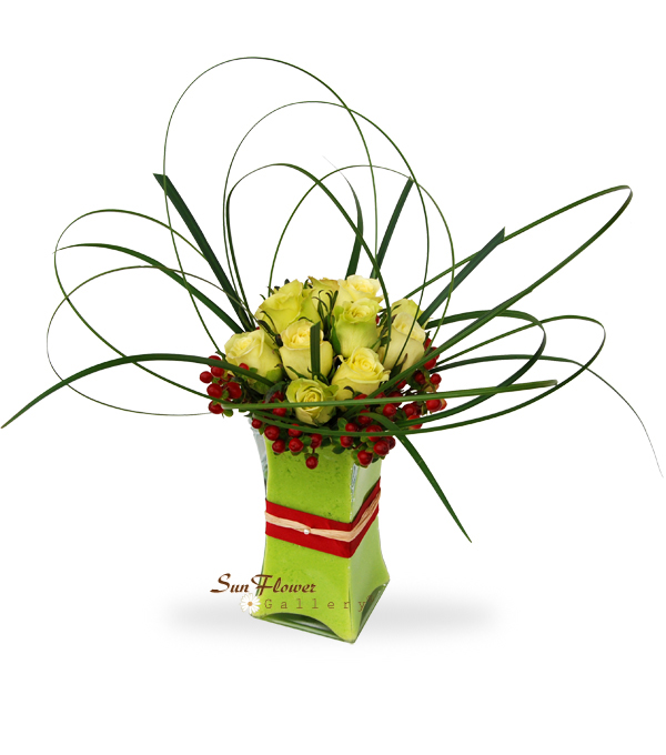 Green Symphony arrangement consists of green roses, red hyperricum berries and lily grass. It s all arranged in a glass vase filled with lime green oasis powder and decorated with a ribbon.