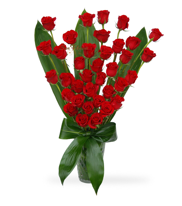Joyful Red Rose Vase sympathy bouquet is a unique and elegant arrangement. This flower composition consists of 36 red roses and ti-leaves in a clear glass vase, lined with ti-leave