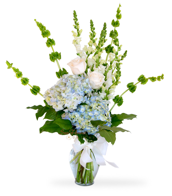 Sympathy bouquet arrangement is crisp and pure like morning due. It consists of light blue hydrangea, white snapdragons, bells of Ireland, white roses and lemon leaves. Suitable for any occasion.